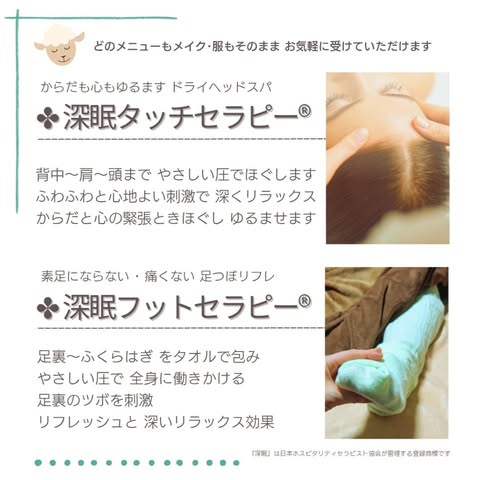 ドライヘッドスパか痛くない足つぼリフレのどちらかをお選びいただけます。