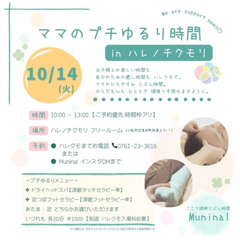 10/14(火)は「ママのプチゆるり時間」ということで、ここち誘眠じぶん時間【Muninal】のマッサージをハレクモで体験できます。