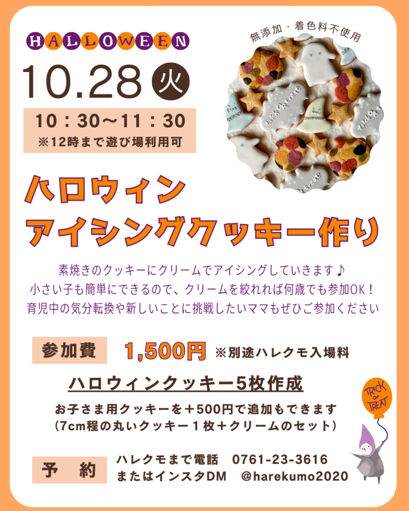 10月のハレクモ日和は無添加・着色料不使用のアイシングクッキー作りと販売を行っている「たまゆら」の畠山先生をお呼びして、ハロウィンアイシングクッキー作りを開催します♪