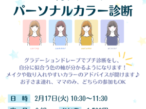 Prev ママ向けイベント「パーソナルカラー診断」 Next 1月お誕生日会