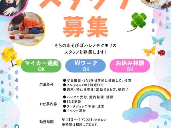 information お知らせ お知らせ 2026.3.17 「おひさま券」のご利用について お知らせ 2026.3.10 スタッフ募集中♪ お知らせ 2025.12.26 年末年始営業のお知らせ お知らせ 2025.12.26 新春ハレクモおみくじ【終了しました】 お知らせ 2025.12.9 「おひさま券」のご利用について お知らせ 2025.12.4 クリスマスイベント【終了しました】 お知らせ 2025.12.4 冬のワークショップ【終了しました】 お知らせ 2025.11.25 ウインターセール お知らせ 2025.10.16 11/8(土)駐車場のご案内 お知らせ 2025.10.11 ハロウィンしずくちゃんを探せ!【終了しました】 123